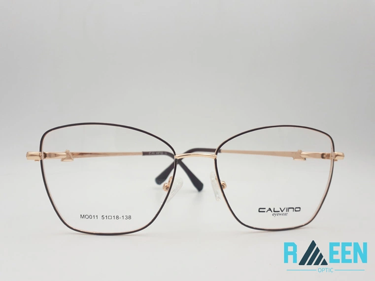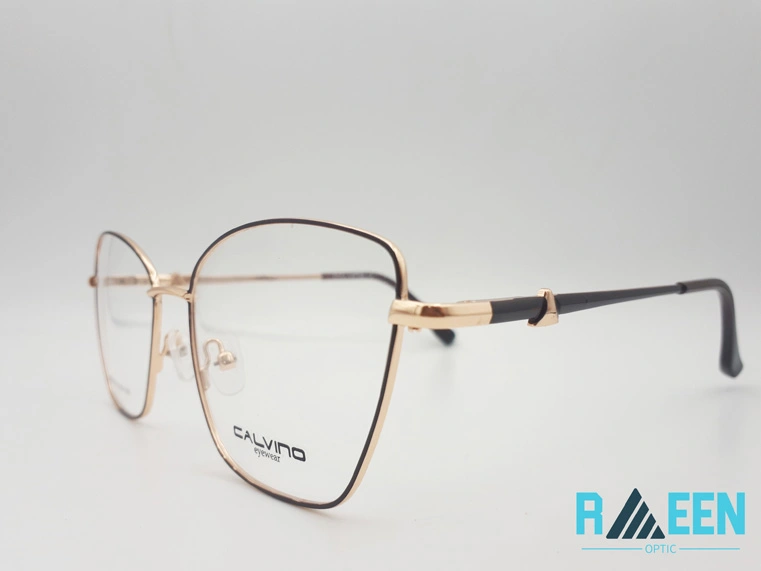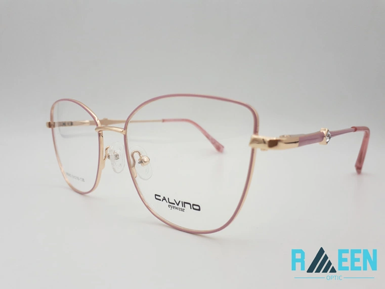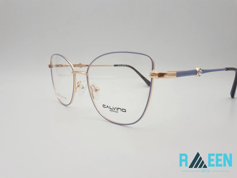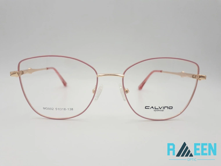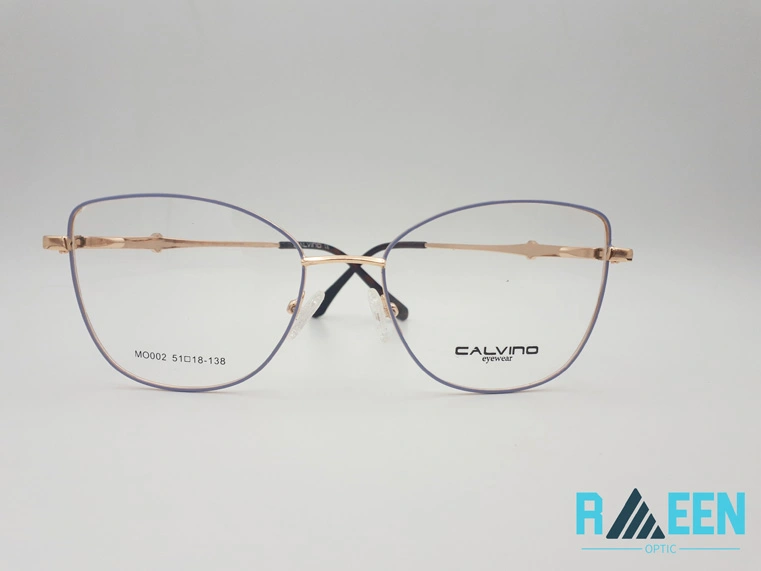 عینک طبی Calvino مدل MO 02 با فریم فلزی سبک و طراحی کت استایل پروانهای. ایدهآل برای صورتهای کشیده و ریزنقش، در 5 رنگ متنوع شامل بنفش طلایی. عرضه به صورت عمده به همکاران محترم عینک فروش.